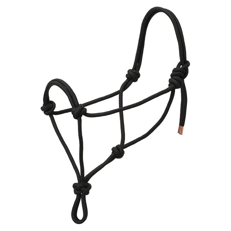 Economy rope halter is hand-knotted from a continuous piece of 3/8" poly rope with a double noseband & crown strap.