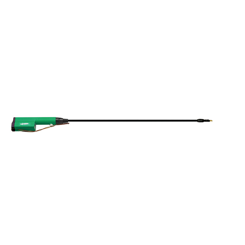 Battery-operated prod for moving livestock with carrying strap and six C-cell batteries included. Comes with interchangeable 42 inch flexible shaft.