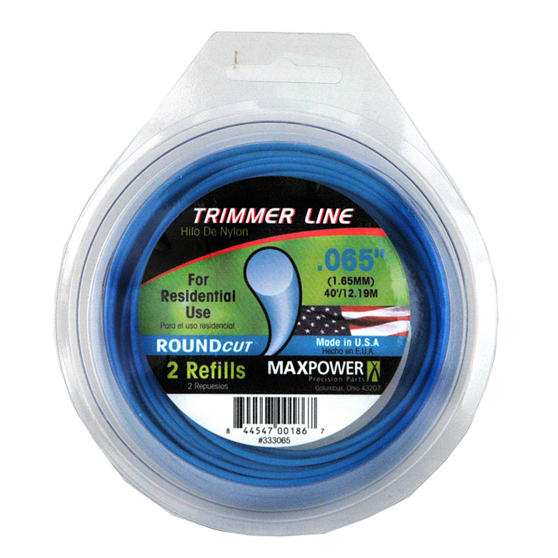 MaxPower's residential grade RoundCut trimmer line measures .065" in diameter & 40' in length for approximately 2 refills on a standard trimmer spool. Trimmer line is made from sturdy nylon components – great for homeowner/residential use. Proudly made in the U.S.A., trimmer line provides a quality cutting line at an economical price.