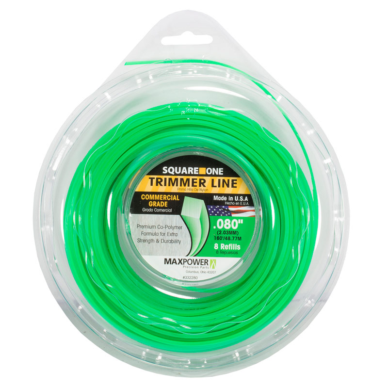 MaxPower's commercial grade SquareOne trimmer line measures .080" in diameter & 160' in length for approximately 8 refills on a standard trimmer spool. SquareOne trimmer line is proudly made in the U.S.A. and formulated from premium blends to be stronger, last longer & provide a better cut. Line is designed for commercial use, heavy duty trimming jobs & larger residential areas.