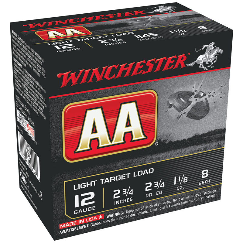 12 Ga. light target loads. 2-3/4" shell size. 1145 fps muzzle velocity. 8 shot, 1-1.8 Oz., 25 rounds.